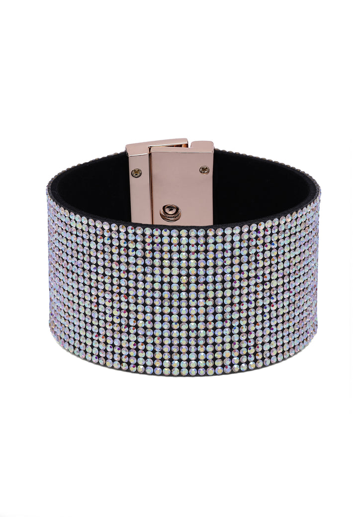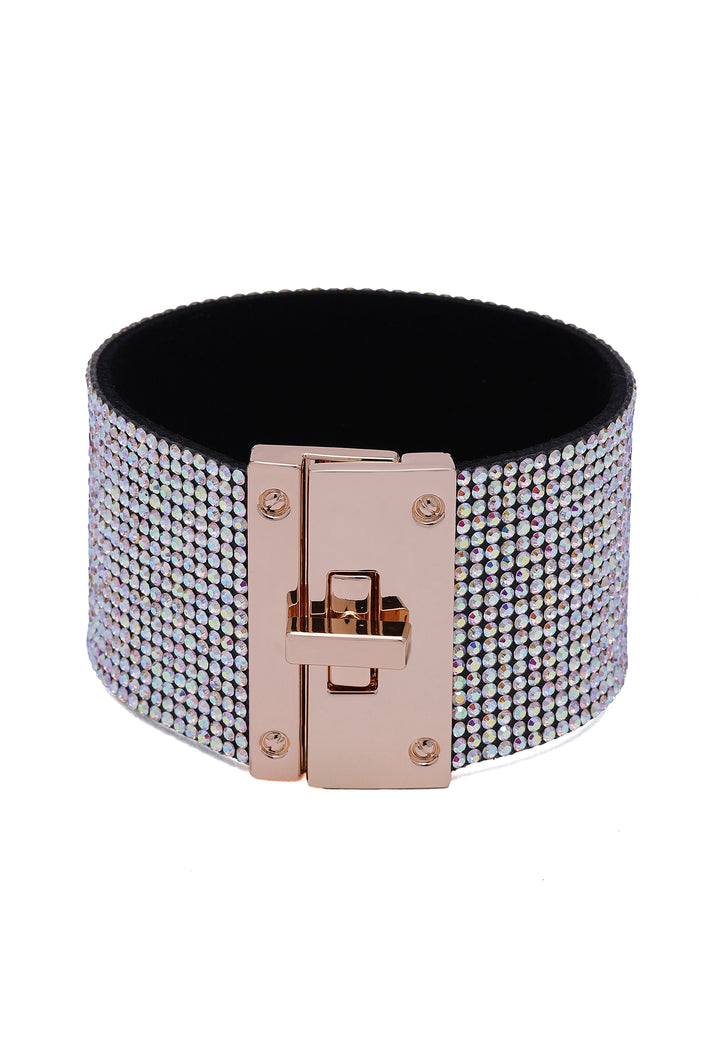 Wrap your wrist in pure diva energy. This wide leather cuff is drenched in multi-coloured crystals, creating a clear shimmer that feels straight off the red carpet. Lined with soft suede and finished with a sleek, high-polish clasp, it’s a bold, luxurious statement piece for nights when you want all eyes on you.